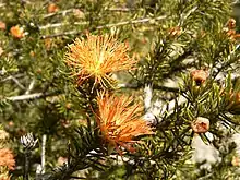 The flowers are orange-coloured and occur singly on the end of branches formed the previous year. The outer surface of the flower cup (the hypanthium) is densely hairy. There are 5 petals 3.2–4.5 millimetres (0.1–0.2 in) long. The stamens, which give the flower its colour, are arranged in 5 bundles, each containing 20 to 26 stamens. Flowering occurs from October to November and is followed by fruits which are woody capsules. The capsules are more or less cup-shaped to spherical, smooth and 7.5–8.1 millimetres (0.30–0.32 in) long.[2]