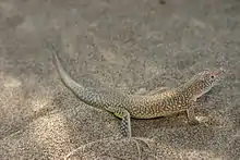 Eremias kavirensis (commonly known as the Maranjaab racerunner) is a large Eremias lizard known only from Kavir National Park, Iran. It has a snout–vent length of up to 83 millimetres (3.3 in); the background colour of the dorsum is sandy, yellowish-brown, and broken by grey transverse bars that are sometimes bordered with darker brown margins. There are dark brown spots on the head that are larger on the posterior head scales. The dorsal side of the limbs has enlarged light spots that, on the tibia especially, merge into semi-transverse stripes.[2]