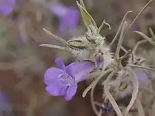The flowers are borne singly or in pairs in leaf axils on hairy stalks 3.5–7.5 mm (0.1–0.3 in) long. There are five very hairy, blackish-purple, linear to lance-shaped, tapering sepals which are 7.5–13 mm (0.3–0.5 in) long. The petals are 23–29 mm (0.9–1 in) long and are joined at their lower end to form a tube. The petal tube is pale lilac to deep lilac-coloured on the outside and white with lilac or purple spots on the inside. The outer surface of the tube and petal lobes is hairy, the inner surface of the lobes is glabrous and the inside of the tube is filled with woolly hairs. The four stamens are fully enclosed in the petal tube. Flowering occurs from April to October and the fruits which follow are oval-shaped with a glabrous, straw-coloured, papery covering and are 6–9 mm (0.24–0.35 in) long.[2][3]