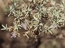 - Eremophila pterocarpa subsp. acicularis[10] which has leaves that are needle-like or linear in shape, 1–2 millimetres (0.04–0.08 in) wide and have a channel along their lower surface.[3]