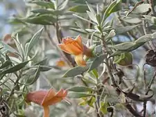 The flowers are red to yellow, lack spots and are arranged singly in the leaf axils on a stalk which is 10–16 millimetres (0.4–0.6 in) long. There are 5 sepals which are narrow egg-shaped to triangular and of approximately equal lengths. The petals, which give the flowers their colour are 14–24 millimetres (0.6–0.9 in) long and joined in a tube with 5 lobes at the end. As with the leaves, the sepals and petals have a dusty covering of short, fine hairs. Flowering occurs between June and September and is followed by fruits which are flattened and dry with papery wings.[2][3][4]