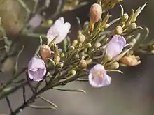 The flowers are borne singly or in pairs in leaf axils on a stalk 2–6 mm (0.08–0.2 in) long which has the same scaly covering as the leaves. There are 5 linear sepals which are 1.5–3.5 mm (0.06–0.1 in) long, covered with the same scaly covering on the outside but are hairy on the inside surface. The petals are 8–25 mm (0.31–0.98 in) long and are joined at their lower end to form a tube. The petal tube is blue, lilac, pink or white on the outside and white with yellow spots inside. The outside surface of the petal tube and its lobes are covered with scaly hairs, the inside of the lobes is glabrous except for branched hairs near their edges and the inside of the tube is densely filled with long, soft hairs. The 4 stamens are enclosed in the petal tube. Flowering occurs throughout the year but mainly from August to October. The fruits are dry, woody, oval to cone-shaped, almost spherical, slightly fleshy, 3.3–5 mm (0.1–0.2 in) long and have a scaly covering.[2][3][4][5][6]