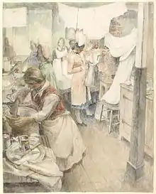 At the start of World War II, Hudson went to Leicestershire and then to Kent, where she delivered her sister-in-law's baby when it was born prematurely during a thunderstorm. In Leicestershire she lived with her brother, the vicar of Ashby Magna, and his family. Here Hudson sketched local women preparing dried herbs and flowers which were sent to hospitals for medicinal uses. She also drew the canteens in Leicester where she helped with packing supply parcels for prisoners of war.[5] Back in London, she moved to a fourth-floor flat in Earls Court and witnessed first-hand the death and destruction of the Blitz. She volunteered as a driver of a mobile canteen, actually a converted laundry van, and made tea and sandwiches for the rescue services attending at bomb sites. Later, she recalled how after a block of flats were bombed, bodies and limbs were strewn around. Visiting her mother in Torquay, she witnessed a similar scene in the aftermath of a bomb destroying a school. Hudson didn't draw these scenes, instead preferring to concentrate on depicting women volunteers hard at work for the war effort. She produced hundreds of paintings and drawings during the war.[3] At Robert Austins suggestion she contacted the War Artists' Advisory Committee, WAAC, who purchased six of her drawings, including Village Women Drying Wild Herbs and WVS Bandage Making. These were displayed in WAAC exhibitions at the National Gallery during the war and then acquired by the Imperial War Museum.[6]