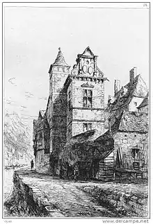 Huy, beside the water. Original etching of the Batta House in Huy, Belgium
