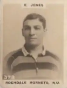 Ernest W. Jones (c.1891 – death unknown) was an English professional rugby league footballer who played in the 1910s and 1920s. He played at representative level for Great Britain and England, and at club level for Rochdale Hornets, as a stand-off or scrum-half, i.e. number 6 or 7.[1]