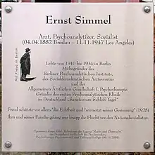 Born in Breslau (Wrocław), Silesia to a secular Jewish background, Simmel moved to Berlin as a child.[1] He studied medicine and psychiatry in Berlin and Rostock. He graduated in medicine in 1908, with a dissertation on dementia praecox. In 1910 he married Alice Seckelson.[2] In 1913 he helped found the Society of Socialist Physicians (VSÄ), and became one of the pioneers of Social Medicine.
