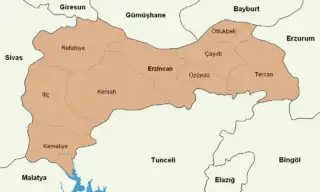 Erzincan Province (Turkish: Erzincan ili; Kurdish: Parezgêha Erzînganê;[2] Armenian: Էրզինկանի զավառ) is a province in the Eastern Anatolia Region of Turkey. In Turkey, its capital is also called Erzincan. Its area is 11,815 km2,[3] and its population is 239,223 (2022).[1]