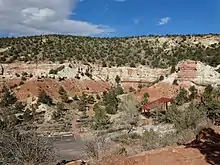 Escalante Petrified Forest State Park (also known as Escalante State Park) is a state park of Utah, USA, located a half-mile (0.8 km) north of the town of Escalante. A visitor center was built in 1991, and features displays of plant and marine fossils, petrified wood and fossilized dinosaur bones over 150 million years old (Upper Jurassic Period). The Petrified Forest Trail is a one-mile (1.6 km) loop, winding up the side of a mesa to the top where most of the fossil wood occurs. Logs two feet or more in diameter are seen at several places along the trail where it is eroding from the conglomerate capping the mesa. This conglomerate lies near the top of the Brushy Basin Member of the Morrison Formation.[4] The wood is multicolored (mostly red, yellow, white, and black) and was prized by hobbyists before the Park was established. The logs are believed to be of conifers that were transported by a river before being buried and later fossilized as agate. A 50 foot (15m) log is displayed near the trail head and is one of the most complete fossil logs known from the Morrison Formation.