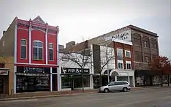 The 900 block of Ludington also consists primarily of two-story Commercial Brick buildings, but also includes the 1914 Flemish Revival Delft Theater, whose style is echoed in the nearby Arcade Recreation Parlor Building and c. 1920 Bonefeld Furniture Building.[2]