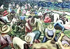 Escogedoras de café (Coffee Pickers) (1939) is a painting by the Ecuadorian social realist artist Alba Calderón. In this tropical-colored painting, peasants are toiling on a coffee plantation overseen by a majordomo with a sheathed machete. The peasants' faces are not shown or are covered by sombreros.