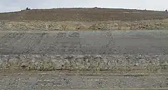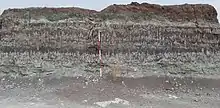 The Eskridge Shale or Eskridge Formation is an Early Permian geologic formation in Kansas. Its outcrop runs north–south through Kansas, extending into Oklahoma and Nebraska.[1] While named a shale, it features extensive, spectacular red and green stacked palosol mudstones, these mudstones showing prominent vertical tubular carbonate concretions, possibly from roots or vertebrate burrows.[2]