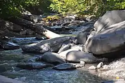 South of the Portal, what is now the "big" portion of the upper Esopus[7] turns southeast after Broadstreet Hollow Creek, with one smaller northern channel remaining closer to the road while the larger southern one bends closer to the base of Garfield Mountain, forming another one-mile portion of the Slide Mountain Wilderness boundary;[21] the two converge at a public parking lot used to put in canoes and kayaks.[27] Three miles (4.8 km) downstream, the creek turns to the south for another mile before turning east where Woodland Creek, the largest right tributary of the Esopus, flows in from the south following the east side of the former Panther crater wall, from its headwaters on Wittenberg Mountain, just east of where Woodland Valley Road crosses. Another 0.8 miles (1.3 km) in that direction, the Esopus reaches Phoenicia, the first major settlement along its course. Route 28 crosses again just west of where the stream receives Stony Clove Creek from the north, where it drains southern Greene County. The creek widens but remains shallow; the Catskill Mountain Railroad parallels its banks.[25]
