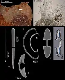 Esperiopsis cimensis sp. nov., Holotype ZMA Por. 07282. A. Habit encrusting a volcanic rock (indicated by arrow). B. Cross section of peripheral skeleton showing plumose spicule brushes. C-E. SEM and light microscopy images of spicules. D. Style. D1. Detail of apices. C. Sigmas. C1. Large sigma. C2. Small sigma. E. Palmate isochelae. E1. Left: large chela in dorsal view; right: large chela in side view. E2. Small chela.