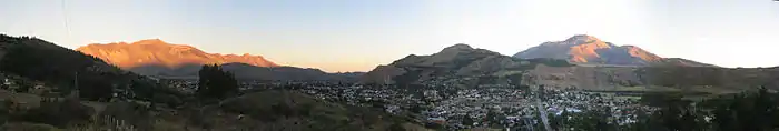 Owing to its location on the immediate leeward side of the Andes, Esquel has a cool summer Mediterranean climate (Köppen Csb) bordering on a Humid continental climate (Köppen Dsb).[3] Other climate systems, such as the Trewartha climate classification, place it within the oceanic zone (Do), like much of Western Europe and the Pacific Northwest. Temperatures are relatively cold for its climate due to its higher altitude.[3] Summers are mild with warm temperatures during the afternoon followed by cool nights.[4] The mean temperature during the summer is around 14 °C (57.2 °F).[3] It's the sunniest season, averaging as much as 10 hours of sunshine per day in January with an average of 7–8 clear days and only 5-7 overcast days.[3][5] Spring and fall are transition seasons featuring mild temperatures during the day and cool to cold nights.[4] Spring starts out with cool temperatures during the day and very cold nights which progressively becomes warmer.[4] Both spring and fall have highly variable weather.[6]