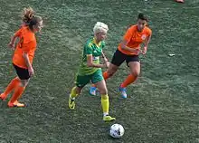 Esra Erol (green/yellow) playing for Kireçburnu Spor in the 2015–16 season's home match against 1207 Antalya Muratpaşa Belediye Spor.