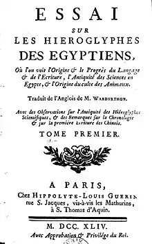 The Essai translated a section (book IV of volume 2) of The Divine Legation of Moses (from 1737) by William Warburton, thought by the original author to have value independent of his main religious thesis.[1][2] The work of de Malpeines, the translator, appeared under the longer title Essai sur Les hiéroglyphes des Égyptiens, où l'on voit l'origine et le progrès du langage et de l'écriture, l'antiquité des sciences en Égypte, et l'origine du culte des animaux.[3] It was based on 140 pages of the original work of Warburton, which in all ran to over 1000 pages. Those pages are the part of the work that is now most remembered.[4]