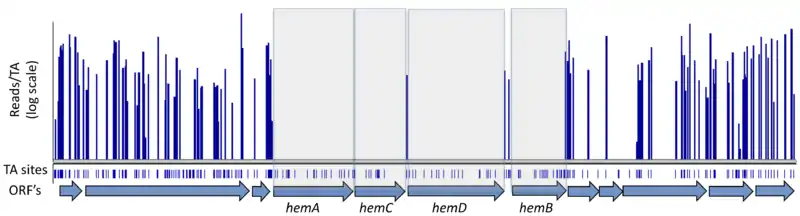 Essential genes in Mycobacterium tuberculosis H37Rv as found by using transposons which insert in random positions in the genome. If no transposons are found in a gene, the gene is most likely essential as it cannot tolerate any insertion. In this example, essential heme biosynthetic genes hemA, hemB, hemC, hemD are devoid of insertions. The number of sequence reads (‘‘reads/TA’’) is shown for the indicated region of the H37Rv chromosome. Potential TA dinucleotide insertions sites are indicated. Image from Griffin et al. 2011.[16]
