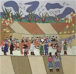 In June 1999, exactly 50 years after she left Europe, Esther returned to Mniszek to see what remained.[2] The landscape of central Poland had not changed: farmers driving horse-drawn wooden wagons, red and yellow fields of poppy and mustard, women carrying baskets overflowing with ripe strawberries. She had embroidered images like that. Both in Mniszek and Grabówka, Esther met again with friends and neighbours from her childhood. "Yes, it was just like that!" they said when she showed them photographs of her sewn art, which she had begun in 1977.[6]