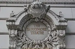 On either side of the doors are terracotta niches with bronze-framed sign boards. Above the signboards are terracotta wreaths, which surround circular panels with the gilded letters "The Barrymore Theater". Each wreath is topped by a curved pediment. The western and eastern portions of the facade are recessed slightly and contain recessed openings.[15] The opening to the east is marked as the stage door.[10][15] A frieze, decorated with leaf and wave moldings, runs above the first floor.[15] To the east, there was originally a stage house with fire escapes on its facade, but this has since been replaced with the Morgan Stanley Building.[17]