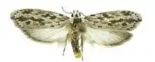 The length of the forewings is 10.6–10.8 mm (0.42–0.43 in) for males and 10.9–11 mm (0.43–0.43 in) for females. The ground color of the forewings is whitish with blackish markings and two distinct spots at the base, as well as two oblique irregular dark blotches directed to but unattached to an elongated mark line from the middle to the termen. The hindwing ground colour is whitish, but darker at the margins.