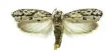 The length of the forewings is 9–9.4 mm (0.35–0.37 in) for males and 9.3–9.5 mm (0.37–0.37 in) for females. The ground color of the forewings is whitish with blackish markings and one distinct spot at the base. There is an oblique, thin dark mark from before the mid-costa connecting with a longitudinal blotch from the middle to the termen. The hindwing ground colour is whitish, but darker at the margins.