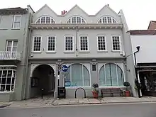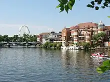 This practice continued until 1845 when a scholar refused to associate with the inns because they were a "temptation" to Eton students.[5] Eton was favourably modernised and was the first village in the UK to have its own post office and modern drainage system.[11] By 1925 the town was described as more commercial than residential, with most of the buildings (apart from those of the school itself) belonging to businesses serving the schoolboys.[5] In April 1970, Windsor Bridge, connecting Eton to Windsor, was closed to all motorised traffic. All traffic must now travel via Royal Windsor Way (formerly the Windsor and Eton relief road),[12] a bypass opened in 1966.