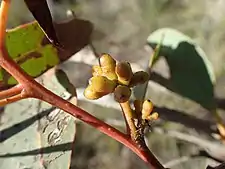 Eucalyptus × balanites, commonly known as Cadda Road mallee, is a tree or a mallee that is endemic to a small area of the south-west of Western Australia.[2] It has rough, corky or flaky bark, lance-shaped adult leaves, flower buds in groups of eleven, creamy-white flowers and hemispherical to cup-shaped fruit.