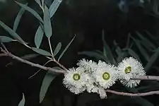 Eucalyptus deuaensis, commonly known as the Mongamulla mallee,[2] is a species of mallee or small tree endemic to a small area of New South Wales. It has smooth bark, lance-shaped to curved adult leaves, diamond-shaped buds arranged in leaf axils in groups of seven, white flowers and bell-shaped, hemispherical or conical fruit.