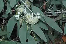 Eucalyptus morrisbyi is a tree that typically grows to a height of 6–16 m (20–52 ft) and forms a lignotuber. It has smooth, pale greyish, or brown bark, often with slabs of loose rough bark near the base of the trunk. Young plants and coppice regrowth have more or less round, sessile leaves that are glaucous, 10–45 mm (0.39–1.77 in) long, 15–40 mm (0.59–1.57 in) wide arranged in opposite pairs and with usually wavy edges. Adult leaves are lance-shaped to egg-shaped or elliptical, the same shade of dull bluish green to glaucous on both sides, 47–100 mm (1.9–3.9 in) long and 15–40 mm (0.59–1.57 in) wide, tapering to a petiole 9–25 mm (0.35–0.98 in) long. The flower buds are arranged in groups of three in leaf axils on an unbranched peduncle 4–10 mm (0.16–0.39 in) long, the individual buds sessile or on pedicels up to 5 mm (0.20 in) long. Mature buds are pear-shaped to oval, 7–8 mm (0.28–0.31 in) long and 5–6 mm (0.20–0.24 in) wide with a conical to beaked operculum. Flowering occurs in most months, peaking from January to April, and the flowers are white. The fruit is a woody barrel-shaped or cylindrical capsule 6–9 mm (0.24–0.35 in) long and 7–8 mm (0.28–0.31 in) wide with the valves below rim level.[2][3][4]