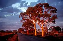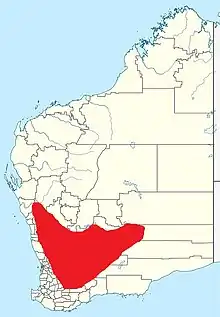Found in large woodland communities, E. salmonophloia is found in the southern Wheatbelt and Goldfields-Esperance region of Western Australia. It exists in the following IBRA regions: from the Geraldton Sandplains in the northwest extending south in the Avon Wheatbelt and into the Jarrah Forest region. The range extends through the Murchison, Mallee, Esperance Plains and Coolgardie regions as far east as the Great Victoria Desert.[3][21] In western areas there are only remnant populations, extending from the York and Northam areas south to around Jerramungup, mostly as a result of agricultural practices. Eastern occurrences are far less disturbed and extend as far as Cundeelee to the north around the Mt Gibson area and to around Salmon Gums to the south.[11] The tree usually dominates these communities, forming a sparse upper canopy. Found growing in broad valleys, plains and low hills in areas that receive as little as 250 millimetres (10 in) of rain per year, it grows in alkaline loamy soils,[11] red clay loam, red clay and red sandy soils, often with gravel.[3] It is found in granite soils in western areas and calcerous soils in eastern areas.[13]