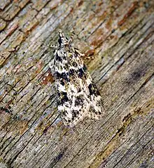 The wingspan is 17–18 mm.The forewings are white, irregularly blackish-mixed with a black triangular mark from base of costa ; lines white, dark-edged, first irregular, second strongly sinuate; an irregular blackish costal blotch beyond first including orbicular and claviform, and a quadrate blotch before second concealing discal spot ; terminal area blackish, subterminal line white, touching second in middle. Hindwings are light grey, darker terminally ; a darker discal mark. The larva is greenish-yellow ; spots, head, and plate of 2 dark bronzy -brown. [1]