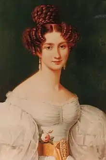 Eugénie Hortense Auguste Napoléone de Beauharnais, princess of Leuchtenberg (22 December 1808 – 1 September 1847) was a Franco-German princess. She was the second daughter of Eugène de Beauharnais and Princess Augusta of Bavaria, and a member of the House of Beauharnais. In 1826 she married Constantine, Prince of Hohenzollern-Hechingen.