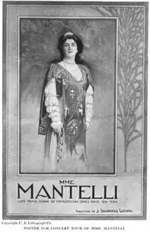 In 1894 Mantelli joined the roster of the Metropolitan Opera in New York City, making her first appearance there as Amneris in Verdi's Aida on 23 November. She remained a member of the company until the end of the 1899–1900 season. One of her most successful roles at the Met was Léonor in La favorite, which she also sang for her first performance at the Royal Opera House, Covent Garden in 1896. She left the Met in 1900 just before she married her husband. Although she returned to the Met briefly in 1902 and appeared in a few vaudeville productions during the early 1900s, she spent most of her remaining career performing at the Teatro Nacional de São Carlos. After retiring from the stage, she remained in Lisbon where she taught singing for many years.[1]