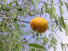 It blooms in early spring. Flowers are typical of myrtaceae; Appearing in the leaf axils, and are white, solitary with up to fifty stamens. About two months later it produces fruits, producing a globose and yellow color fruit, of up to 5 cm of diameter. It tastes similar to peach (Prunus persica) giving its vulgar name of peach tree. The fruit is edible, with the orange pulp, very juicy, slightly tart aftertaste when fully ripe.
