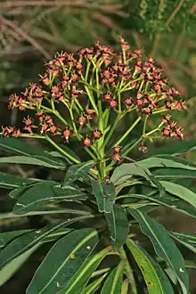 Euphorbia mellifera, the Canary spurge[2] or honey spurge,[3] is a species of flowering plant in the spurge family Euphorbiaceae, native to Madeira and the Canary Islands.[4][5] It is an evergreen shrub or tree growing to 2.5 m (8.2 ft) tall and broad,[6] with narrow leaves up to 20 cm (8 in) long. In spring it produces brown, honey-scented flowers.[7]