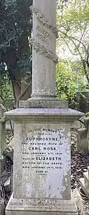Parepa died in London, after an illness, at the age of 37 while preparing to sing Elsa in an English version of Wagner's Lohengrin as part of her husband's planned season a Theatre Royal, Drury Lane; after her death, Rosa cancelled the season.[1][8] She is buried at Highgate cemetery.[9] After her death, Rosa endowed the Parepa-Rosa Scholarship at the Royal Academy of Music in her memory.[3]