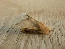 The wingspan is about 50 mm. Adults are hairy and brown, with a broad white band along the terminal area of each wing and a dark brown body.