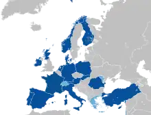 Countries with a member orchestra in EFNYO (associated members in light blue; overseas members not shown)