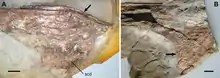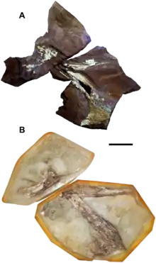 The holotype, MCCM-LH 9413, was uncovered at the Las Hoyas site in a chalkstone layer of the Calizas de La Huergina Formation dating from the late Barremian. It consists of a partial skull with lower jaws, compressed on a slab and counterslab. Two elements of the hyoid are present also. The skull has been vertically crushed, the lower jaws horizontally. The specimen was prepared by Mercedes Llandres Serrano, and is part of the Las Hoyas collection of the Museo de las Ciencias de Castilla–La Mancha.[1]