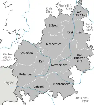 Euskirchen (German pronunciation: [ˈɔʏskɪʁçn̩] ⓘ) is a Kreis (district) in the south-west of North Rhine-Westphalia, Germany. Neighboring districts are Aachen, Düren, Rhein-Erft-Kreis, Rhein-Sieg, Ahrweiler, Daun, Bitburg-Prüm, and the Liège province (Belgium).