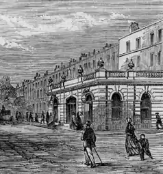 The station was opened as "Gower Street" on 10 January 1863 by the Metropolitan Railway (MR), the world's first underground railway.[8] The line runs east–west under Euston Road at this point. The station originally had entrances in single-storey pavilions with stone-effect stucco render on each side of Euston Road with stairs to the platforms.[9]