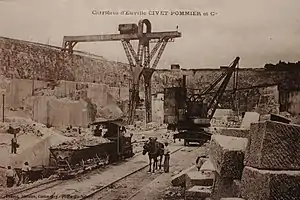 Workers, animals and a Decauville steam locomotive were used to push and pull the 600 mm gauge V-tip waggons in the quarries.