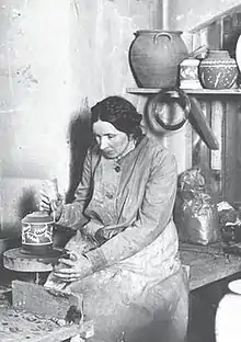 But it was increasingly in ceramics that Jancke-Björk developed her design work, first for the Rörstrand porcelain factory (1915–1921), then for Sankt Erik Lervarufabriker (1921–1925) and finally for Bo Fajans (1925–1956).[1][2] After her husband died in 1919, she opened her own pottery in Mölndal, employing the potter Hugo Säfström from the local handicrafts school as well as other assistants. Designed in a simple, traditional style from locally soured clay, her works proved popular. In 1921, they were displayed in Gothenburg's central arcade and at Galleri Ny Konst. Thanks to a travel grant from the Swedish Arts and Crafts Association (Slöjdföreningen), she was able to study ceramics in Germany and Italy.[1]