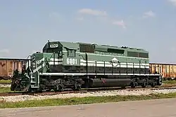 The Evansville Western Railway's locomotive fleet primarily consists of rebuilt EMD hood units purchased from other railroads. They are all painted to match its parent company P&L Transportation's traditional green, white, & black color scheme with the classic diamond herald.[8] In addition to the company-owned roster, the railroad is also leasing a few more units from GATX Corporation.