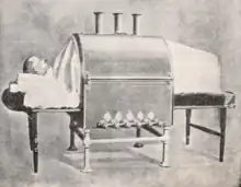 Sheffield and Tallerman, who were supposedly "very friendly", together took a patent in Victoria, Australia in 1894.[2] The developed version of their treatment became known as the "Tallerman–Sheffield hot-air treatment" and received scholarly interest, being publicised in the medical journal The Lancet.[1] The patented "Tallerman–Sheffield Hot-Air Treatment of Disease" was used to treat joint problems and rheumatism through hot dry air baths (essentially "baking" the patient); the technique was tested successfully at St Bartholomew's Hospital in London in 1894 and quickly began being used in other hospitals in the city as well as internationally in cities such as Paris, Berlin, Baden-Baden and Philadelphia. They ensured that the treatment would be available for free so that poor people would have access to it.[2]