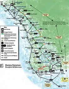 The Everglades Wilderness Waterway is a 99-mile navigable recreational waterway route within Everglades National Park, also known as Marjory Stoneman Douglas Wilderness. It includes many interconnecting creeks, rivers, lakes and inner bays that are navigable by shallow draft powerboat, kayak or canoe. The official Wilderness Waterway route is 99 miles long, but a traveler can use various additional route options to greatly extend or slightly shorten the trip.