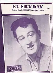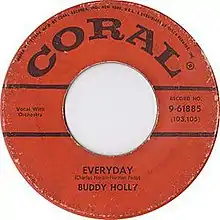 "Everyday" is a song written by Buddy Holly and Norman Petty, recorded by Buddy Holly and the Crickets on May 29, 1957, and released on September 20, 1957, as the B-side of "Peggy Sue". The single went to number three on the Billboard Hot 100 chart in 1957.[2] "Everyday" is ranked number 238 on Rolling Stone magazine's list of the "500 Greatest Songs of All Time".[3]