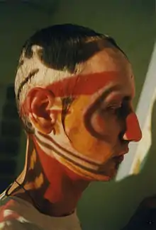 Kozlov's studio “Russkoee Polee” (“The Russian Field”, 1989–1991) at No. 145 Fontanka River Embankment was a meeting place for artists, curators, and gallerists.[18] In 1990, the Austrian performance artist Wolfgang Flatz teamed up with Kozlov for a body-painting session;[19] this was filmed for the public by ZDF, the German TV channel.[20] That same year, he saw the Berlin curator Hannelore Fobo visiting his studio. Kozlov settled in Berlin and later married Fobo.[21] At Russkoee Polee, Kozlov created his main cycle of works from the Leningrad period, “Новая Классика” (Novaya Klassika), or “New Classicals”, consisting of six motifs, each painting in a 2x3m format: Love for Man, Love for Woman, Love for the Cosmos, Love for the Earth (two versions, one being in the Collection of Centre Pompidou, Paris.[22]), Love for Work, Love for the Wonderful (two versions). The seventh motif, “Love for God” exists as a draft.