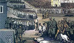 The Executions of Kokkinia[1] (Greek: Μπλόκο της Κοκκινιάς) took place on the August 17, 1944, and was the largest Nazi roundup[2] and one of the largest-scale war crimes perpetrated during the German occupation of Greece. The operation was carried out by members of the Luftwaffe and collaborationist Security Battalions, and involved the execution of hundreds of civilians (mostly partisans), thousands of hostages being sent to concentration camps, and the burning down of entire house blocks, as well as significant atrocities.[3][4][5][6][7] The massacre was partly in retaliation for the Germans' defeat in Battle of Kokkinia five months before, on 4-8 March 1944.[8] The leaders and members of the Security Battalions involved in the killings were never convicted by the Greek state.