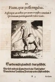 A dromedary camel passing through the eye of a needle, as a symbol of the improbable Peace of Westphalia. Engraving, Johann Vogel: Meditationes emblematicae de restaurata pace Germaniae, 1649.